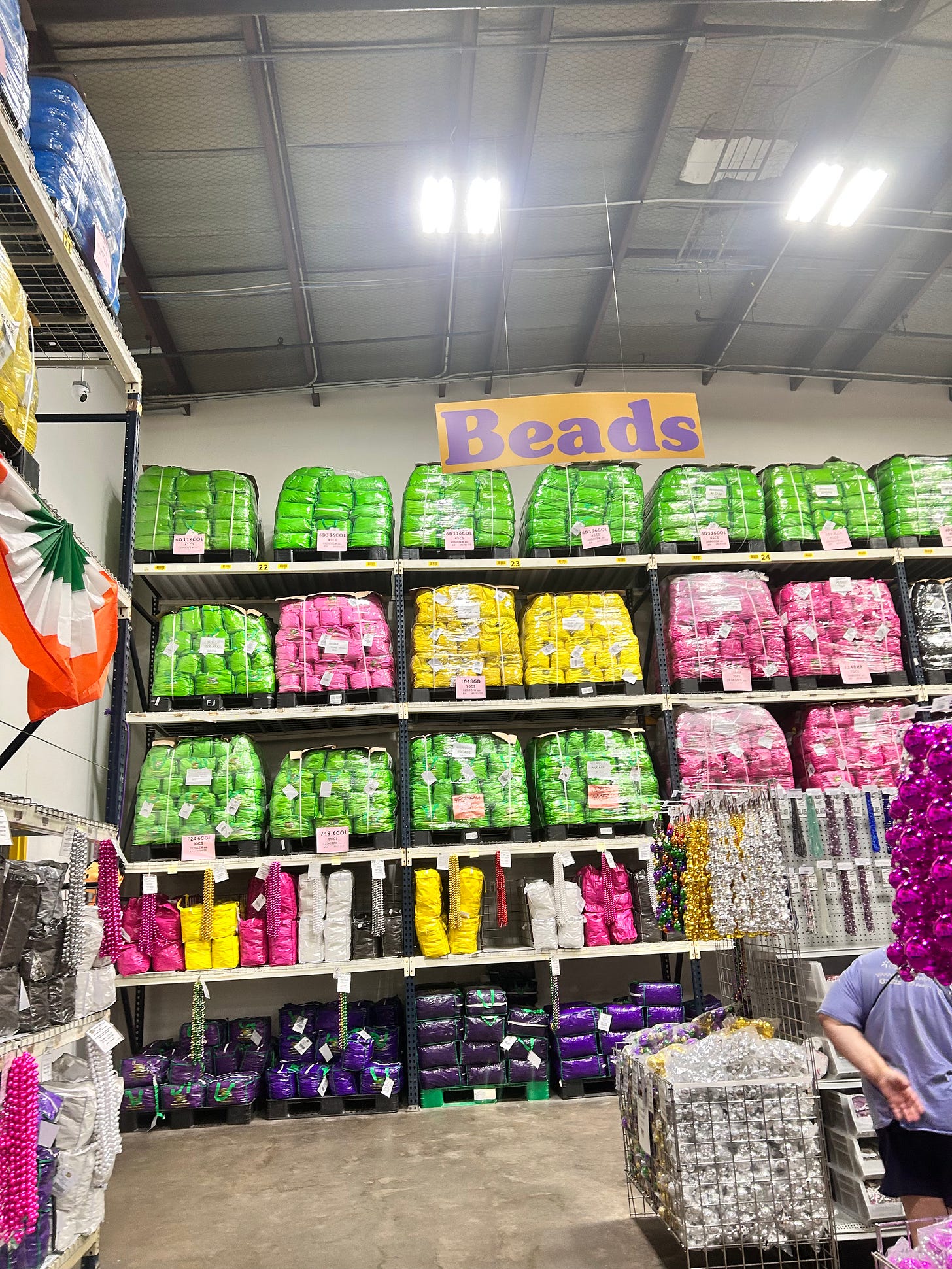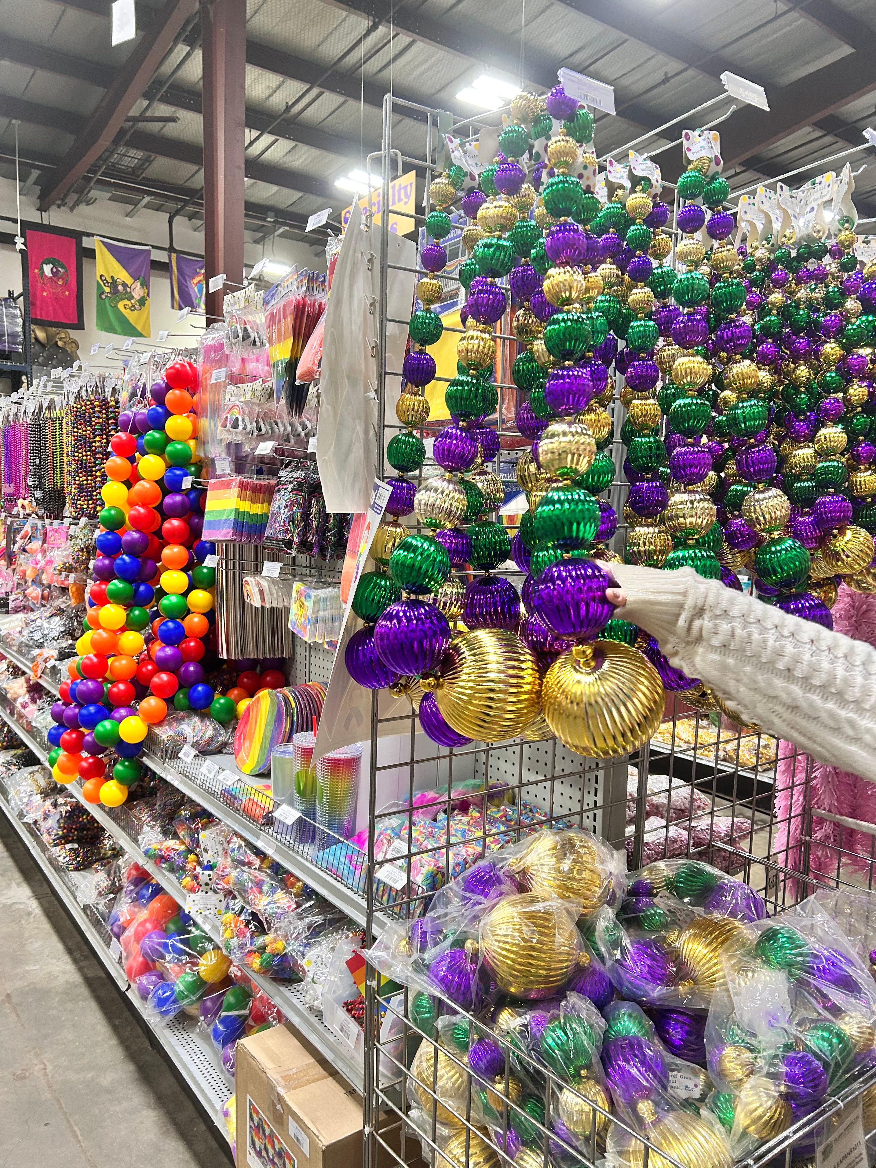 Carnival is here. Plush Appeal is open for business and busy. It’s a warehouse full of Mardi Gras supplies. They have aisles and aisles of everything, not just beads, though there are walls that are stacked to the ceiling with pallets of plastic beads.